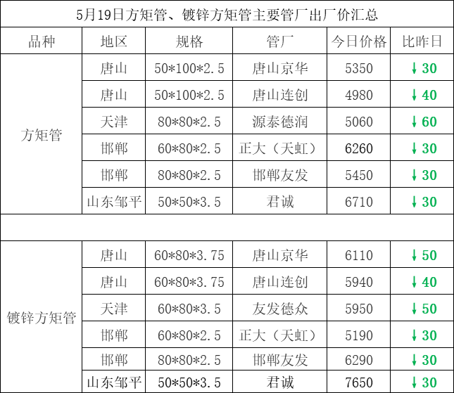 5月19日方矩管主要管厂出厂挂牌价汇总