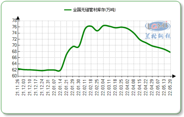 据兰格钢铁云商数据平台监测显示:截至20日,国内23个城市无缝管社会库存总量67.76万吨,周同比下降1.43%。