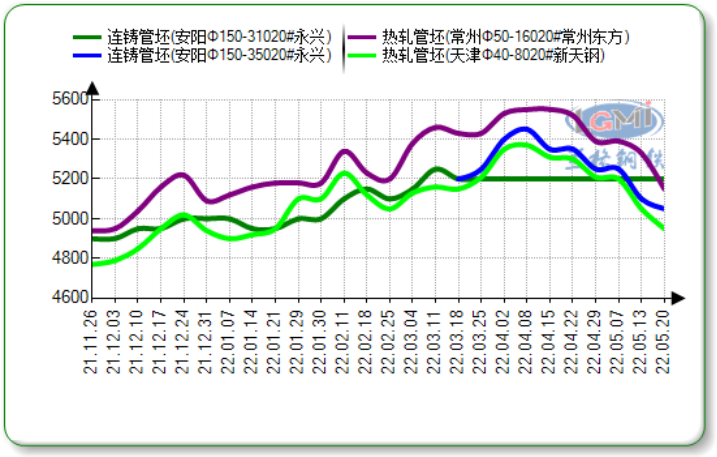 本周(5.16-5.20)国内无缝管市场价格大幅下跌,跌幅50-150元。上游管坯价格累计下调50-180元,现20#热轧管坯出厂报价4950-5520元。北方主流民营管厂无缝管出厂累计下调50-250元,据兰格钢铁云商数据平台监测显示:截至20日,国内十大主导城市108*4.5市场均价6419元,较上周同期跌54元。本周国家统计局公布的4月份各项数据不及预期,使得钢材市场信心受挫,悲观情绪占据主导地位,期货盘面出现连续下跌,同时方坯价格跌超春节后最低值,使得无缝管市场十分被动,无缝管上下游均出现严重倒挂现象。不过20日受央行5年利率调整的影响,市场看跌情绪得到缓解。但是当前需求支撑不足,无缝管市场多以观望为主。