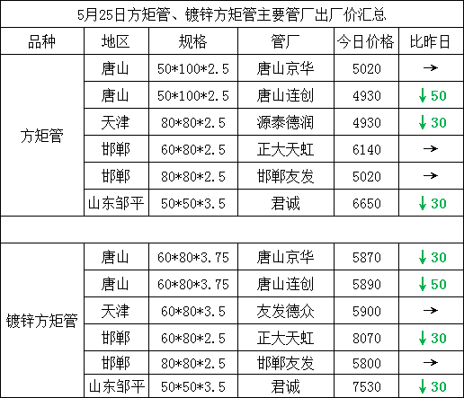 5月25日方矩管、镀锌方矩管主要管厂出厂价汇总
