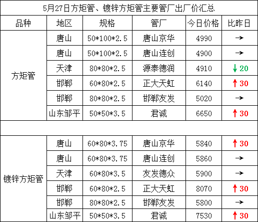 5月27日方矩管、镀锌方矩管主要管厂出厂价汇总