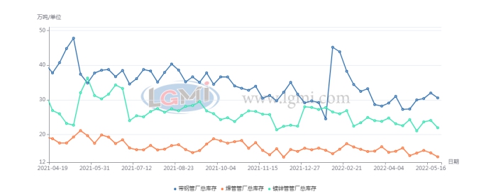 管厂方面,据统计,天津唐山邯郸主流管厂:截止5月27日,原料带钢库存30.59万吨,比上周同期降1.42万吨,比上月同期增3.21万吨,比去年同期降4.28万吨;焊管库存13.59万吨,比上周同期降1.14万吨,比上月同期降0.35万吨,比去年同期降6.11万吨;镀锌管库存21.97万吨,比上周同期降2.12万吨,比上月同期降2.35万吨,比去年同期降14.34万吨;日均成交量2.69万吨,比上周同期增0.12万吨,比上月同期增0.45万吨,比去年农历同期增0.61万吨。