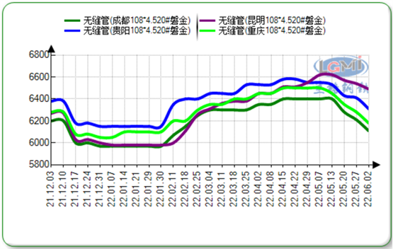 本周(5.27-6.2)西南地区无缝管市场价格本周持稳。本周,市场持续稳定政府释放利好信息,对市场作用微乎甚微,期货市场震荡上涨,但是受到终端需求谨慎的制约,价格上行动力不足。
