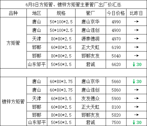 6月7日方矩管、镀锌方矩管主要管厂出厂价汇总