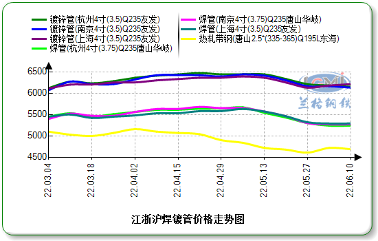 6月上旬江浙沪焊管、镀锌管价格逐步止跌,跌幅50元左右。据兰格钢铁云商平台监测数据显示,江浙沪地区焊管4寸*3.75mm主流报价5100-5200元,镀锌管4寸*3.75mm主流报价6000-6100元;区域内南京、杭州、上海价差50元左右,镀锌管与天津市场价差收窄至200元左右。