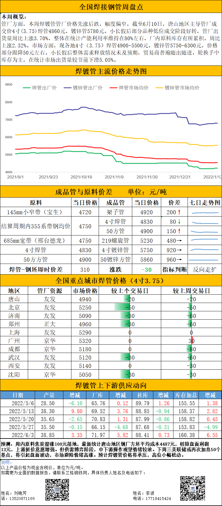 - 国内重点城市焊管、镀锌管库存汇总(06.10)2022/6/10