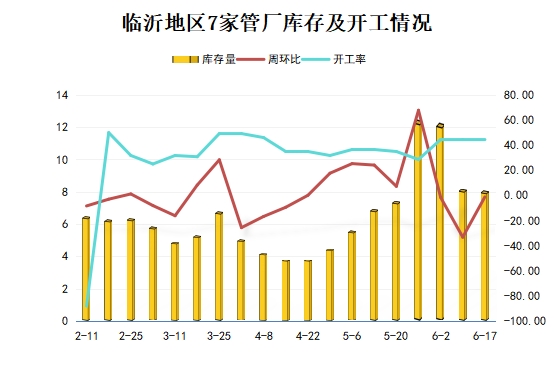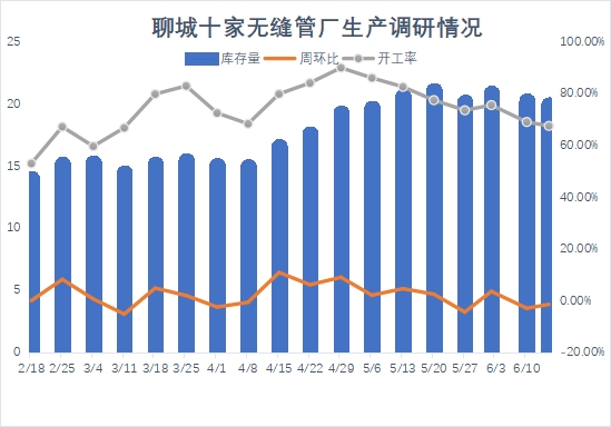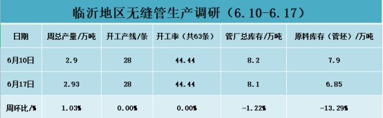 表1 2022年临沂地区无缝管调研情况 截至6月17日,临沂地区63条生产线(含1条连轧机组)开工率44.44%,较上周持平,周总产量2.93万吨,较上周增加0.03万吨。临沂地区7家管厂总库存8.1万吨,较上周减少0.1万吨;原料库存6.85万吨,较上周减少1.05万吨,周环比减少13.29%。临沂地区运费偏高,资源紧张的问题仍然没得到解决,加之天然气价格偏高导致管坯成本价格仍高位,下游需求处于恢复期,管厂较为灵活把控厂内库存。