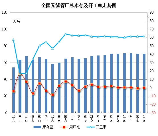 图1 2022年全国无缝管总库存及开工率 据兰格钢铁对样本企业调研无缝管生产情况,截至6月17日:全国200条(含长流程钢管厂40条)生产线开工率61.5%,较上周持平,总库存70.8万吨,较上周减少0.05万吨。本周,美联储联邦公开市场委员会(FOMC)将基准利率上调75个基点至1.50%-1.75%区间,并且表示下一次依然有可能加息50至75个基点。此消息尤其冲击市场信心,使管厂加上下游出货情况都有所下降。