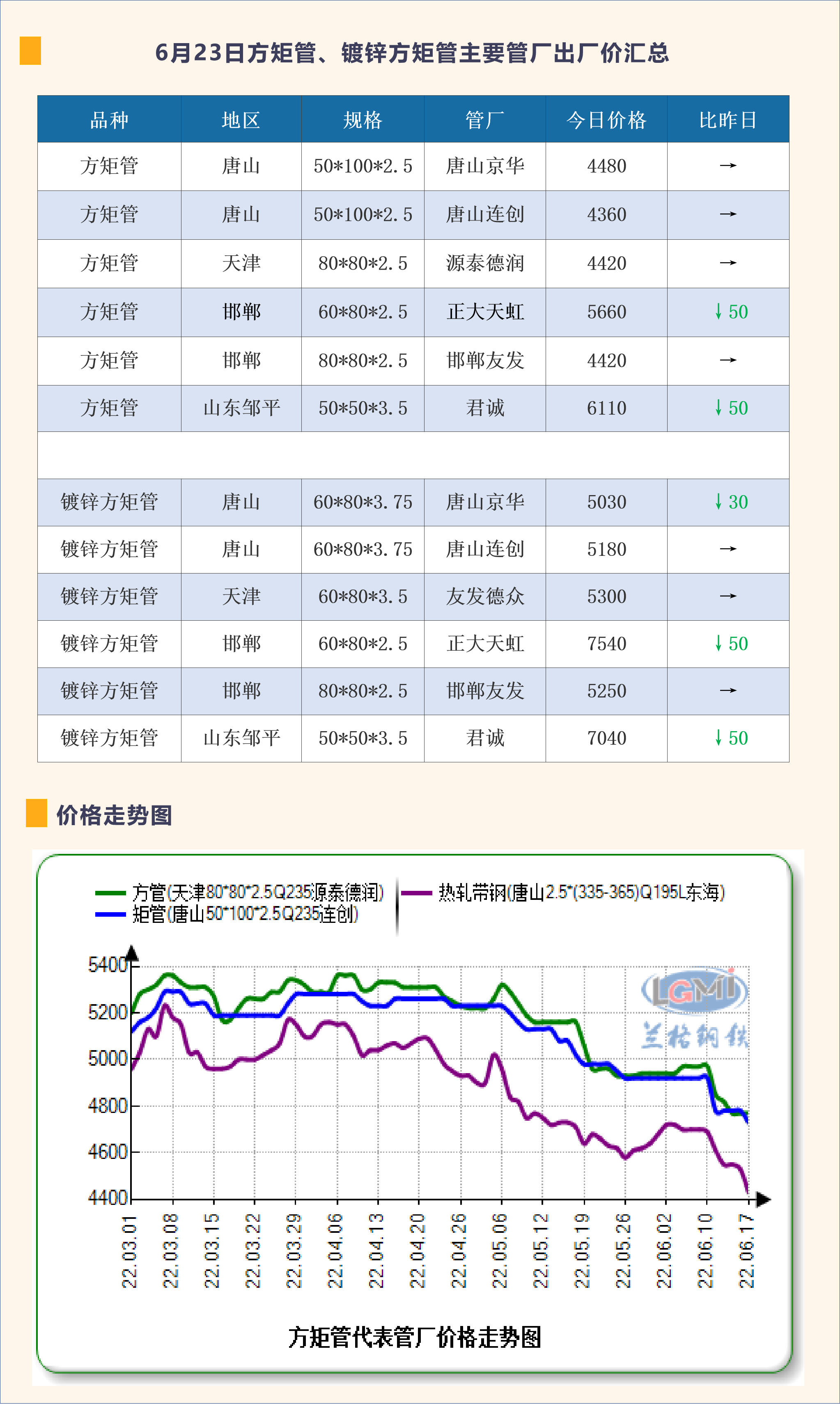 6月23日方矩管、镀锌方矩管主要管厂出厂价汇总