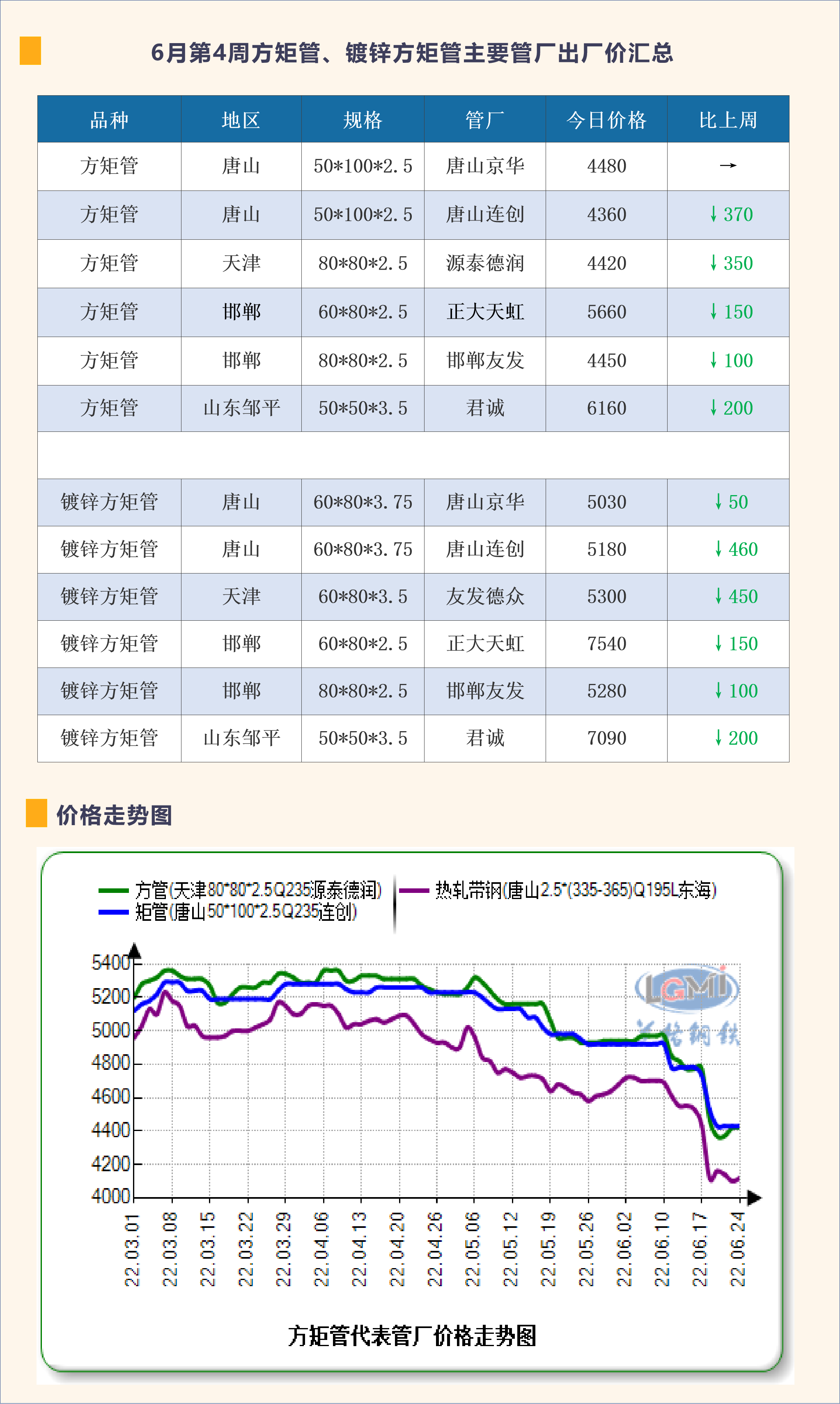 6月22日方矩管、镀锌方矩管主要管厂出厂价汇总
