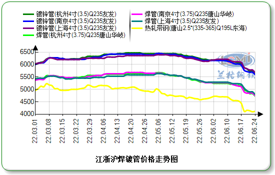 6月下旬江浙沪焊管、镀锌管价格跌势扩大,跌幅500元左右。据兰格钢铁云商平台监测数据显示,江浙沪地区焊管4寸*3.75mm主流报价4600-4700元,镀锌管4寸*3.75mm主流报价4300-4500元;区域内南京、杭州、上海趋于一致,镀锌管与天津市场价差收窄至150元左右。