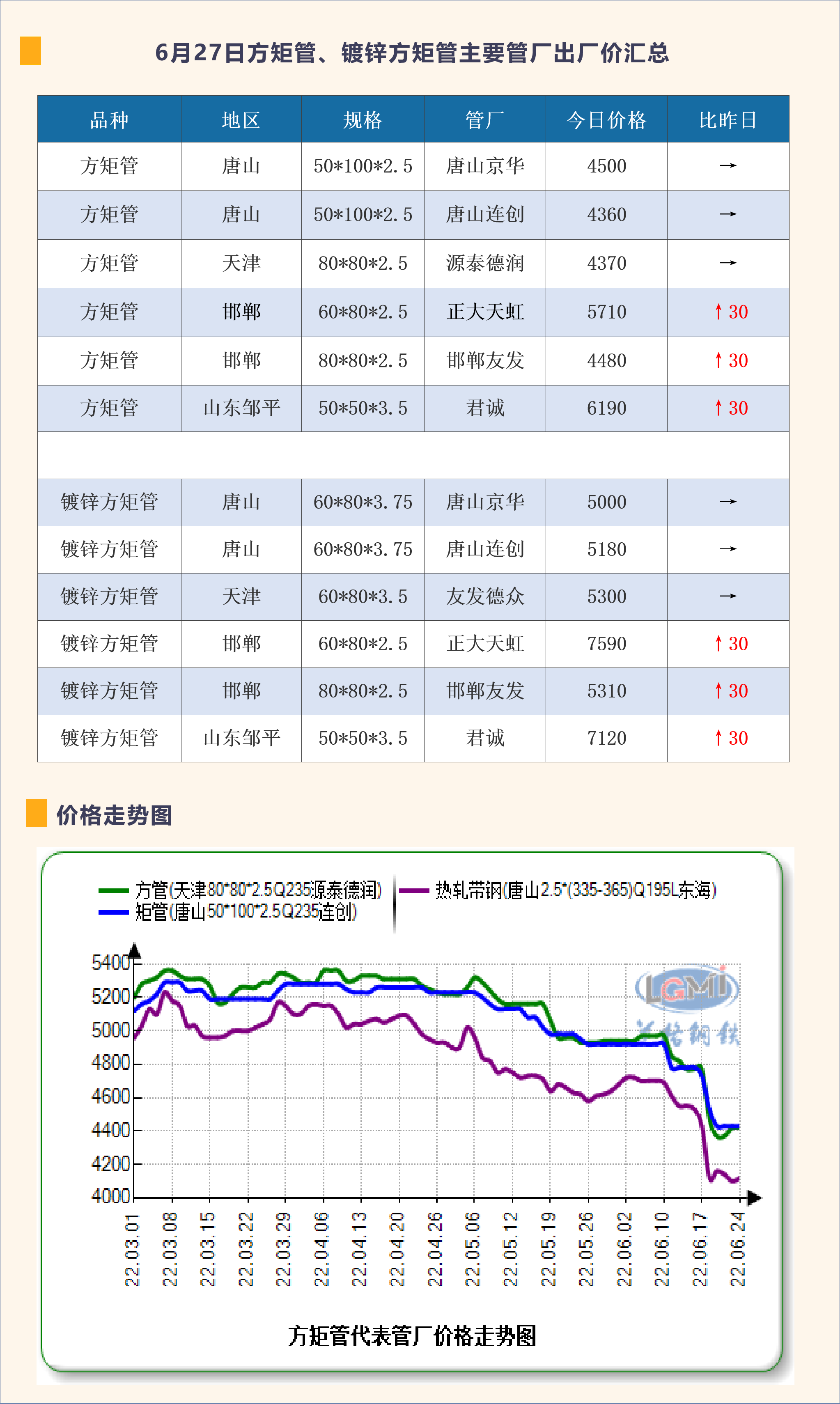6月27日方矩管、镀锌方矩管主要管厂出厂价汇总