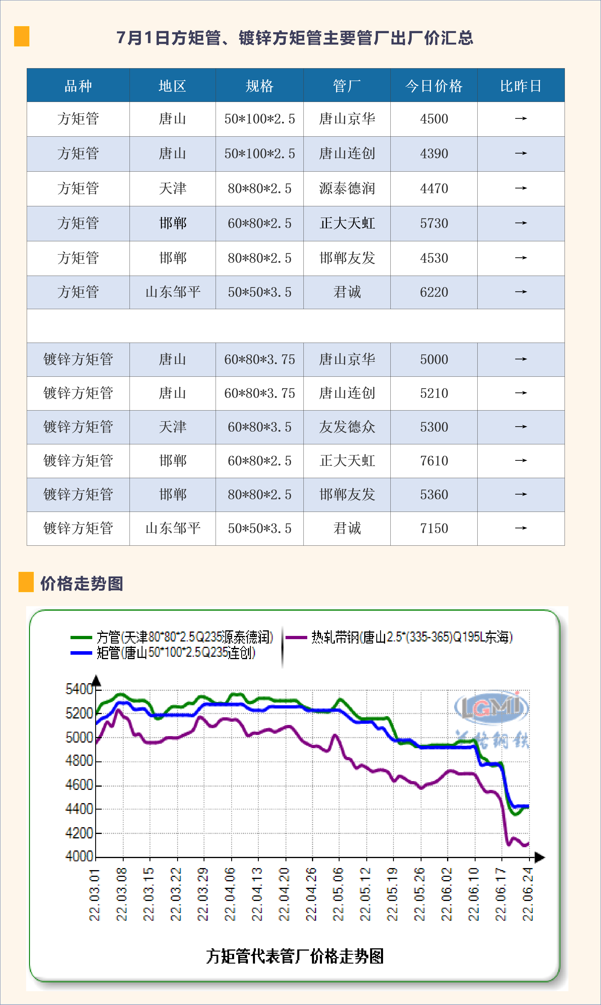 6月22日方矩管、镀锌方矩管主要管厂出厂价汇总