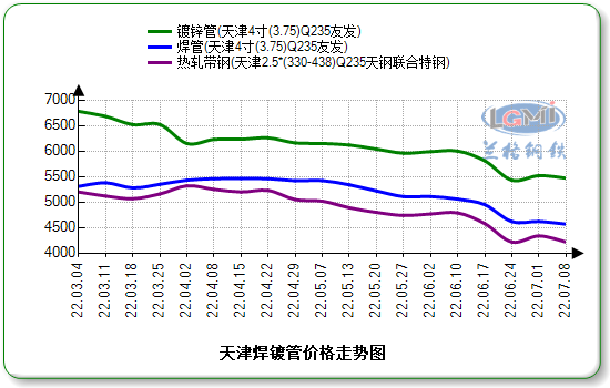截至7月7日,在统计天津样本焊镀管厂原料库存10.26万吨,增库3.70%;成材库存15.81万吨,周比增库1.83%;焊镀管市场库存总量13.94万吨,周比降库1.21%。