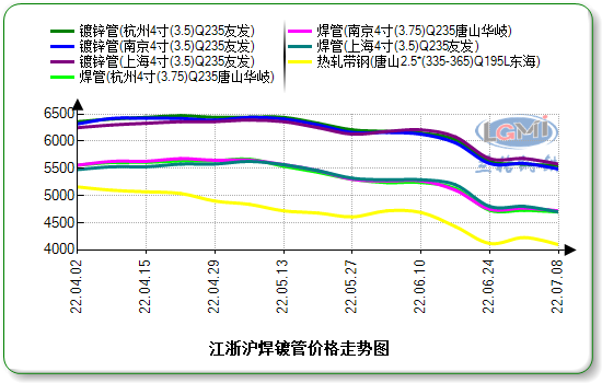 7月上旬江浙沪焊管、镀锌管价格继续寻底,跌幅百元左右。据兰格钢铁云商平台监测数据显示,江浙沪地区焊管4寸*3.75mm主流报价4500-4600元,镀锌管4寸*3.75mm主流报价5200-5400元;区域内南京、杭州、上海趋于一致,镀锌管与天津市场价差收窄至150元左右。