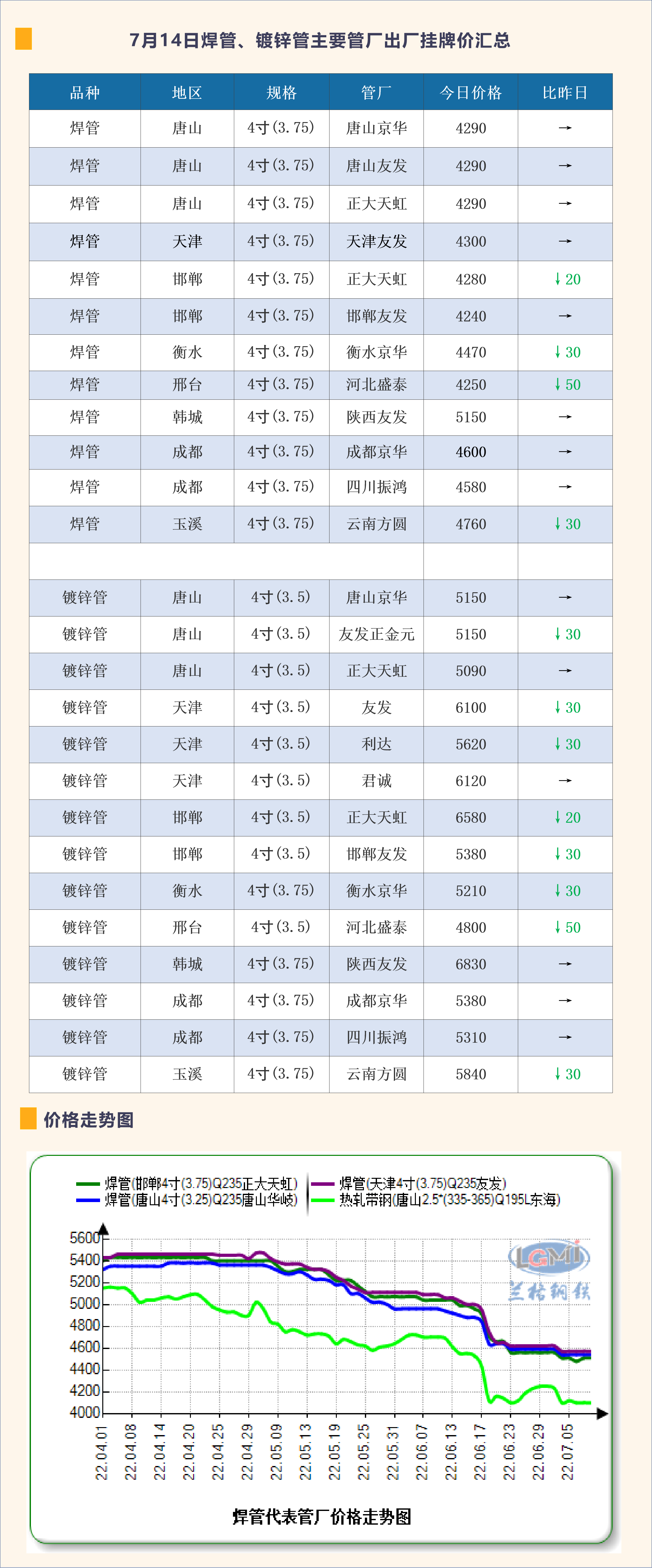 7月14日焊管、镀锌管主要管厂出厂挂牌价汇总
