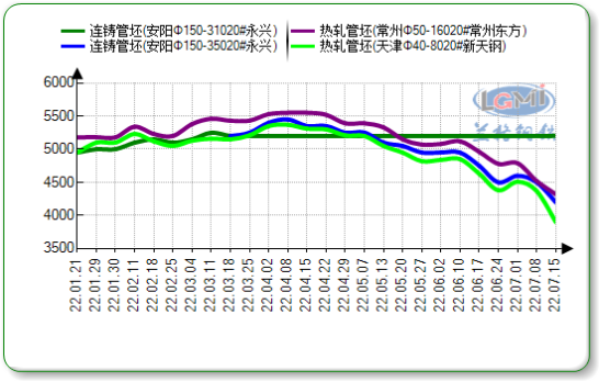 本周(7.11-7.15)国内无缝管市场价格大跌,跌幅达150-300元。上游钢厂管坯出厂价格下跌150-300元,市场累跌180-580元,现江浙沪地区20#热轧管坯市场报价4080-4140元,山东地区管坯市场报价3950-4100元。北方主流民营管厂无缝管出厂价格累计下跌50-450元,市场跟跌明显,据兰格钢铁云上数据平台监测显示,截至15日国内十大主导城市108*4.5无缝管市场均价5904元,较上周同期跌128元。