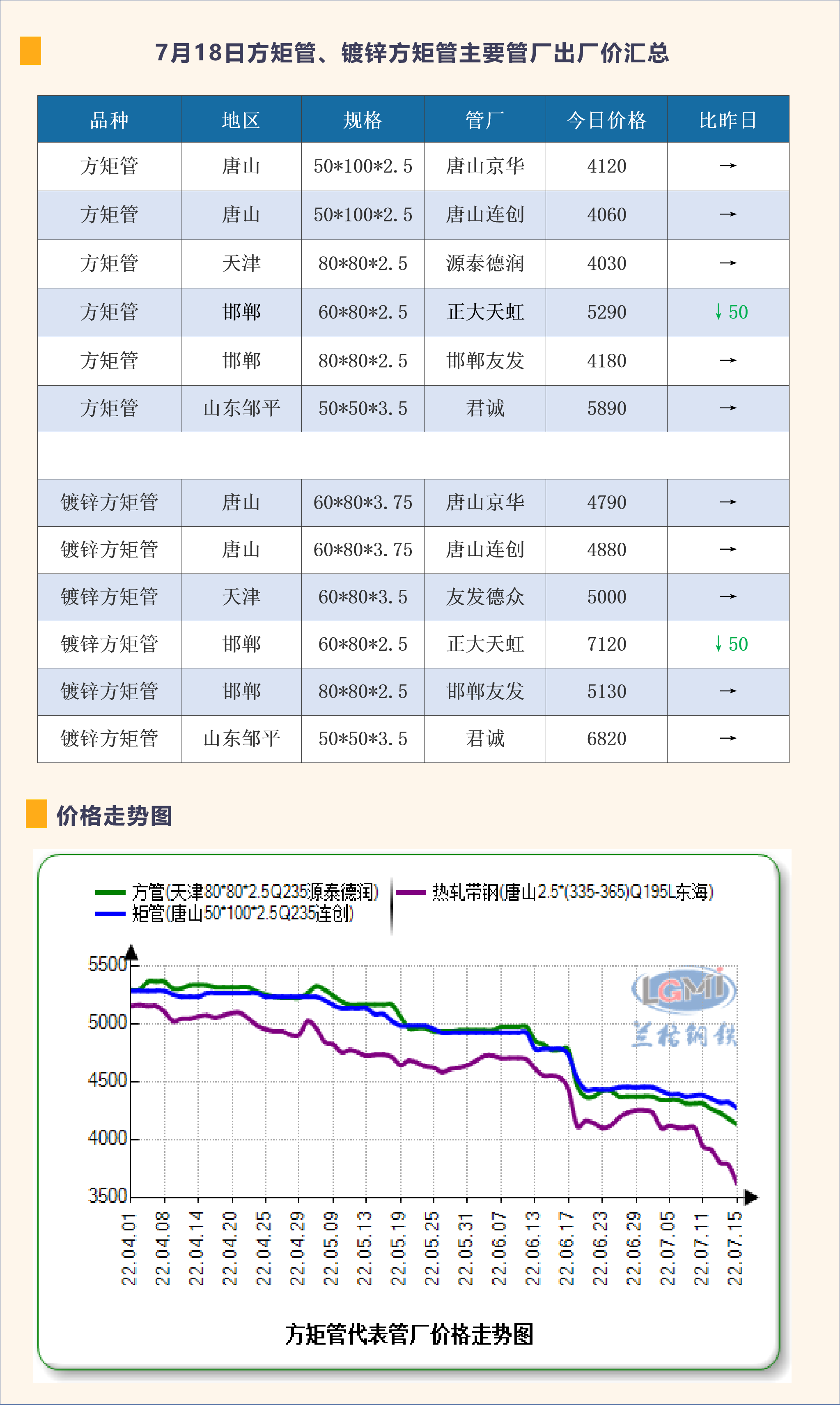 7月18日方矩管、镀锌方矩管主要管厂出厂价汇总