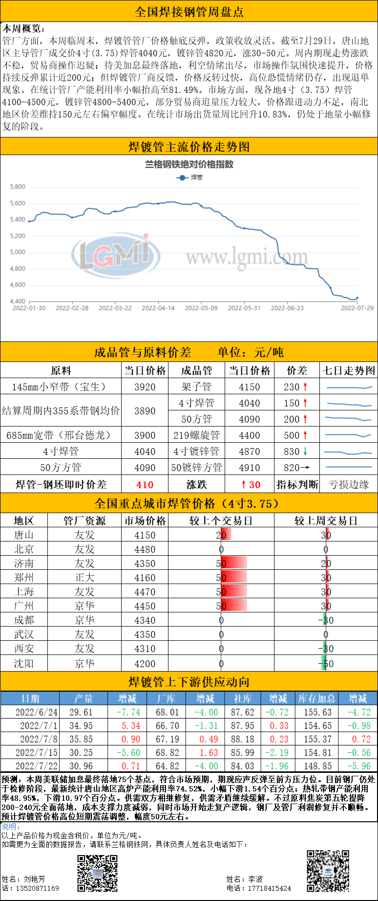 - 乐从焊管、镀锌管库存统计(07.29)2022/7/29
