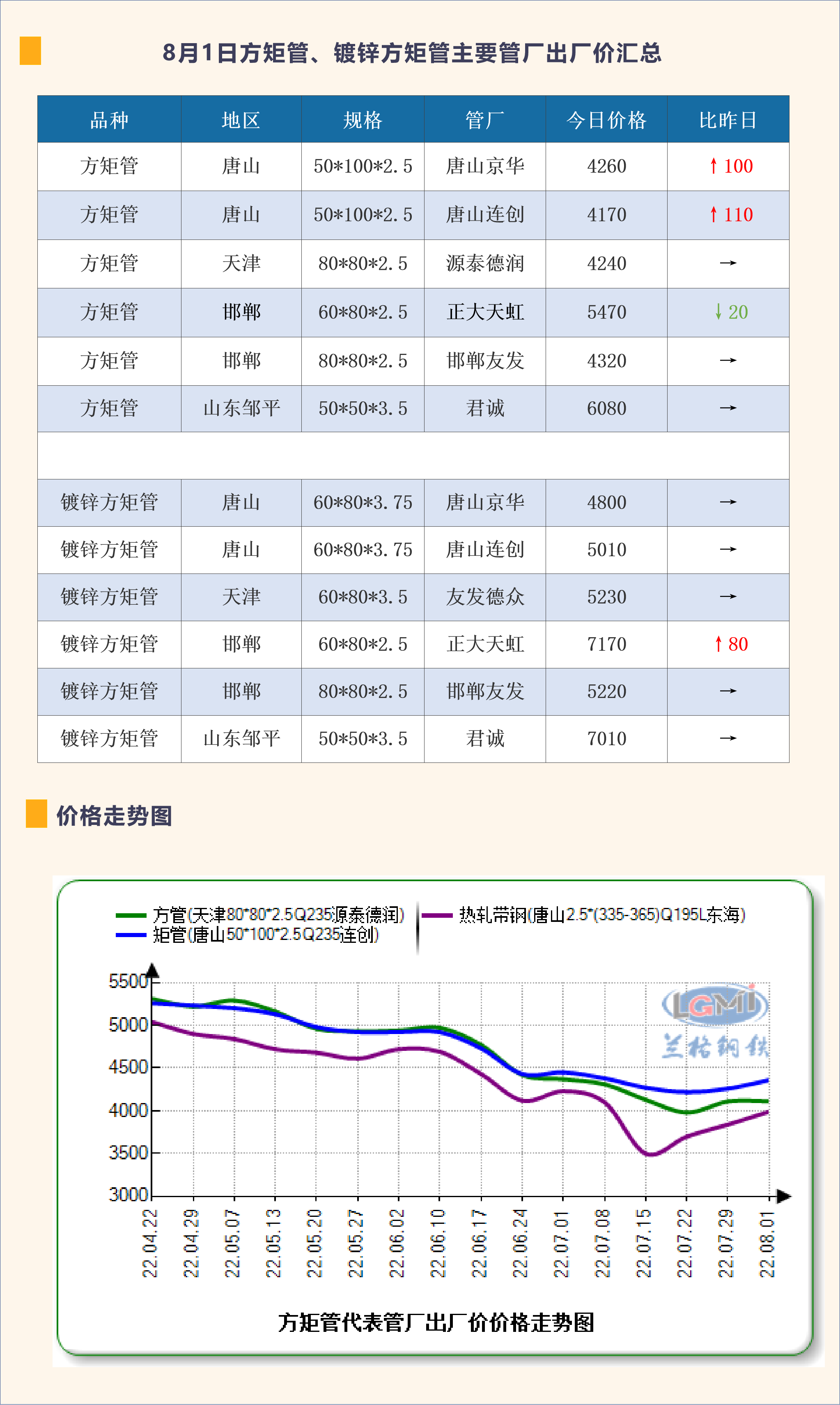 8月1日方矩管、镀锌方矩管主要管厂出厂价汇总