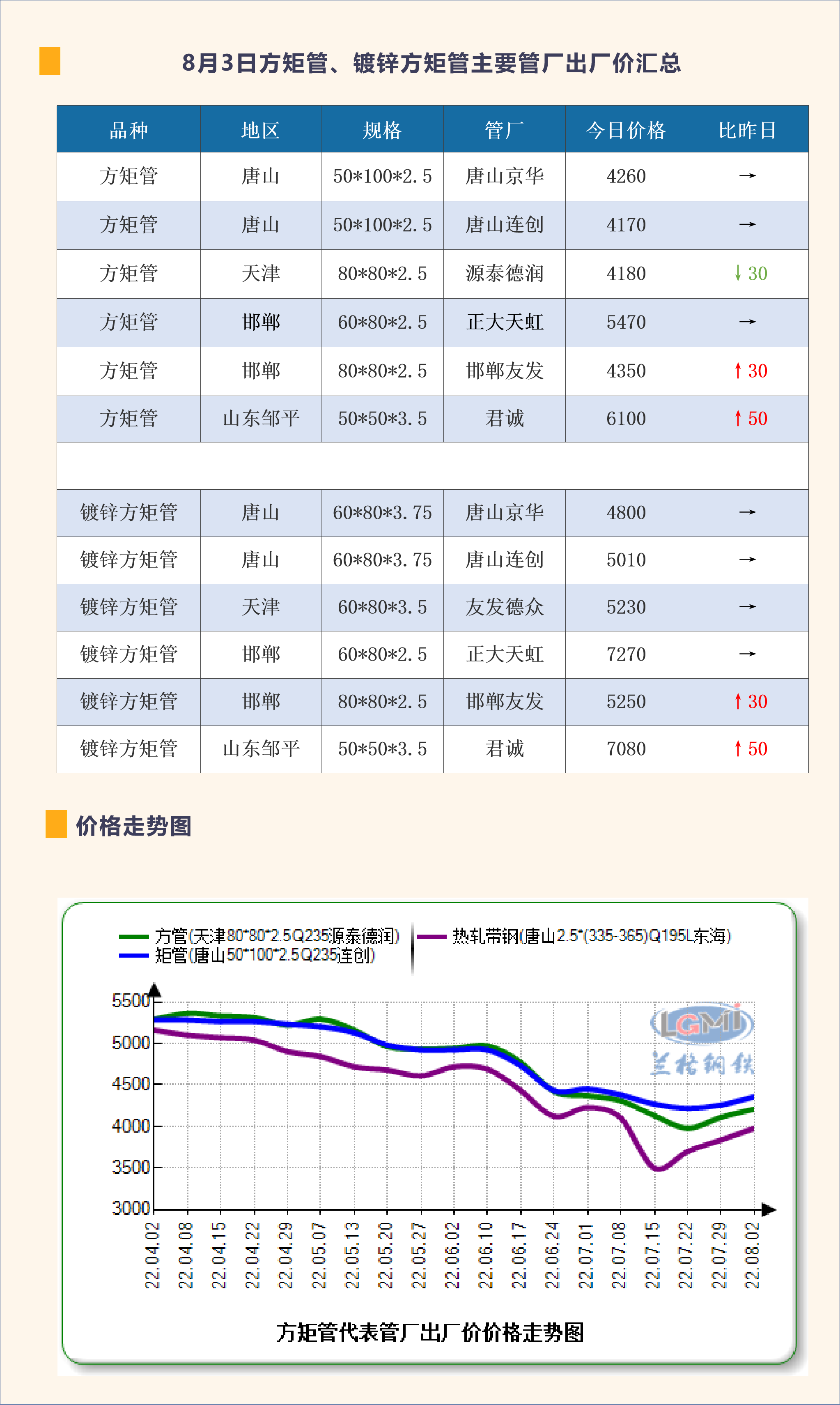 8月3日方矩管、镀锌方矩管主要管厂出厂价汇总
