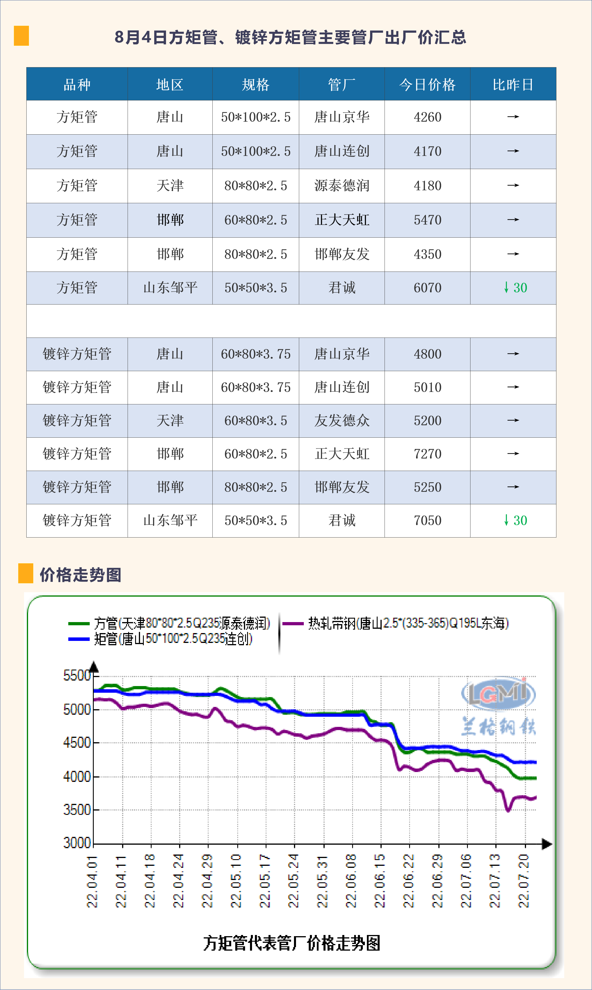 8月4日方矩管、镀锌方矩管主要管厂出厂价汇总