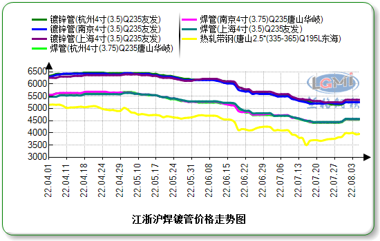 8月上旬江浙沪焊管、镀锌管价格超跌反弹,幅度50-60元,弱于上游。据兰格钢铁云商平台监测数据显示,江浙沪地区焊管4寸*3.75mm主流报价4400-4500元,镀锌管4寸*3.75mm主流报价5100-5300元;区域内南京、杭州、上海差价50元,同资源镀锌管与天津市场价差维持150元左右偏窄幅度。