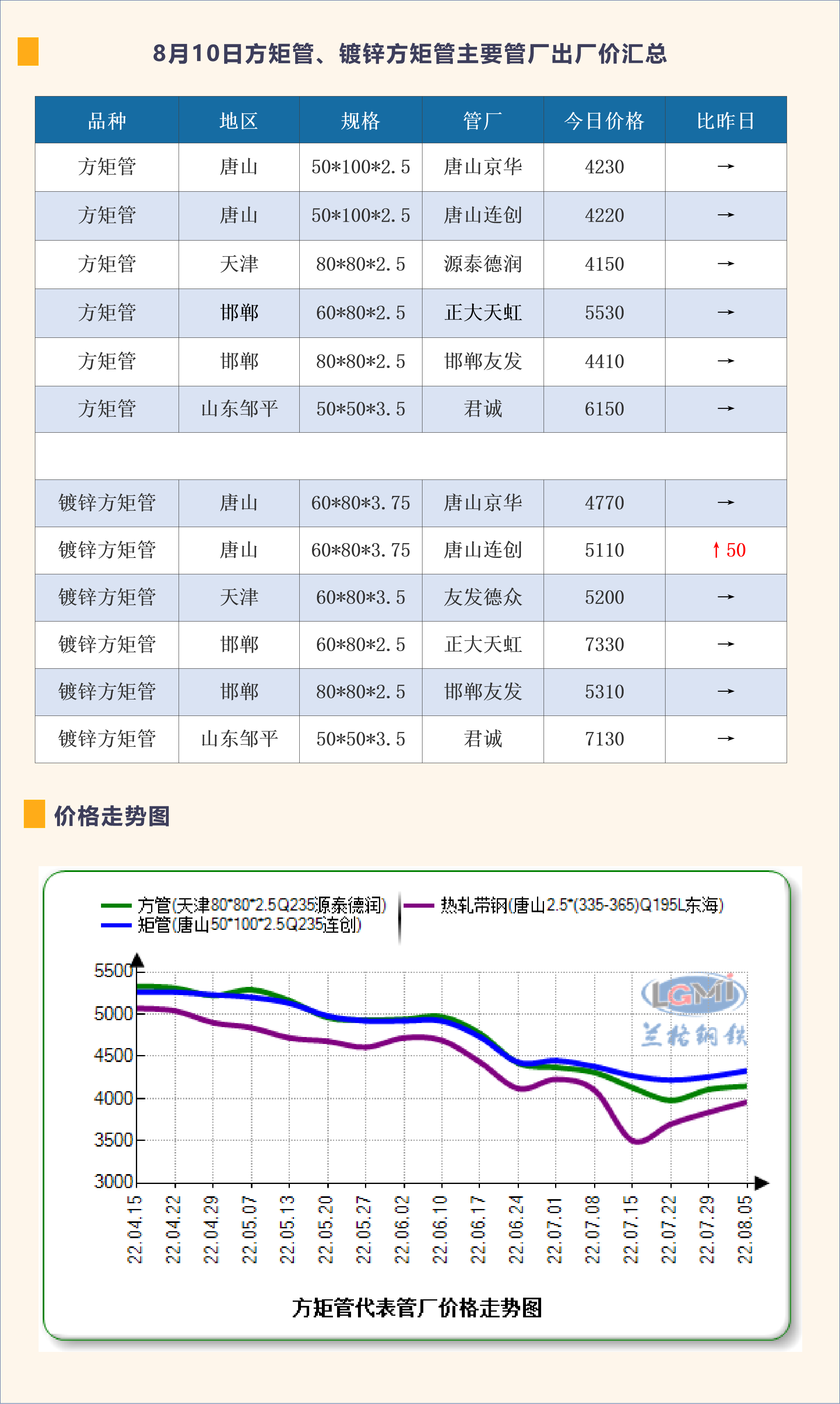 8月10日方矩管、镀锌方矩管主要管厂出厂价汇总