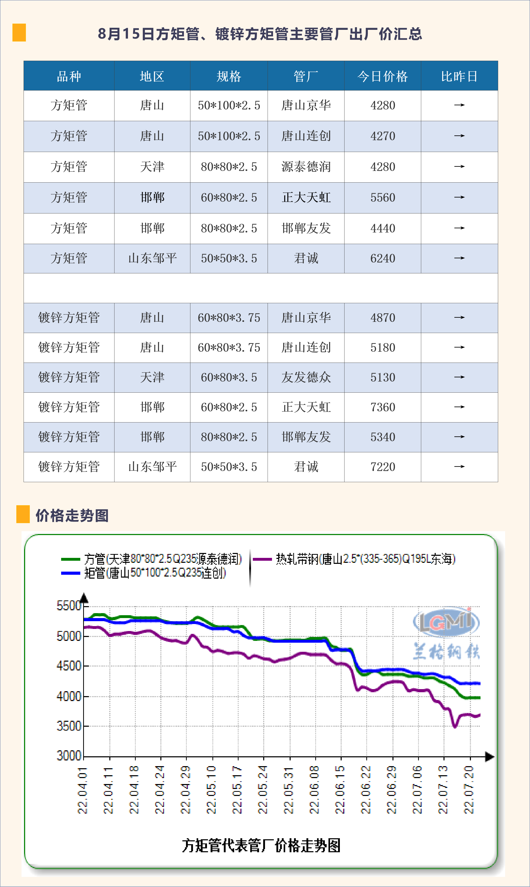 8月15日方矩管、镀锌方矩管主要管厂出厂价汇总