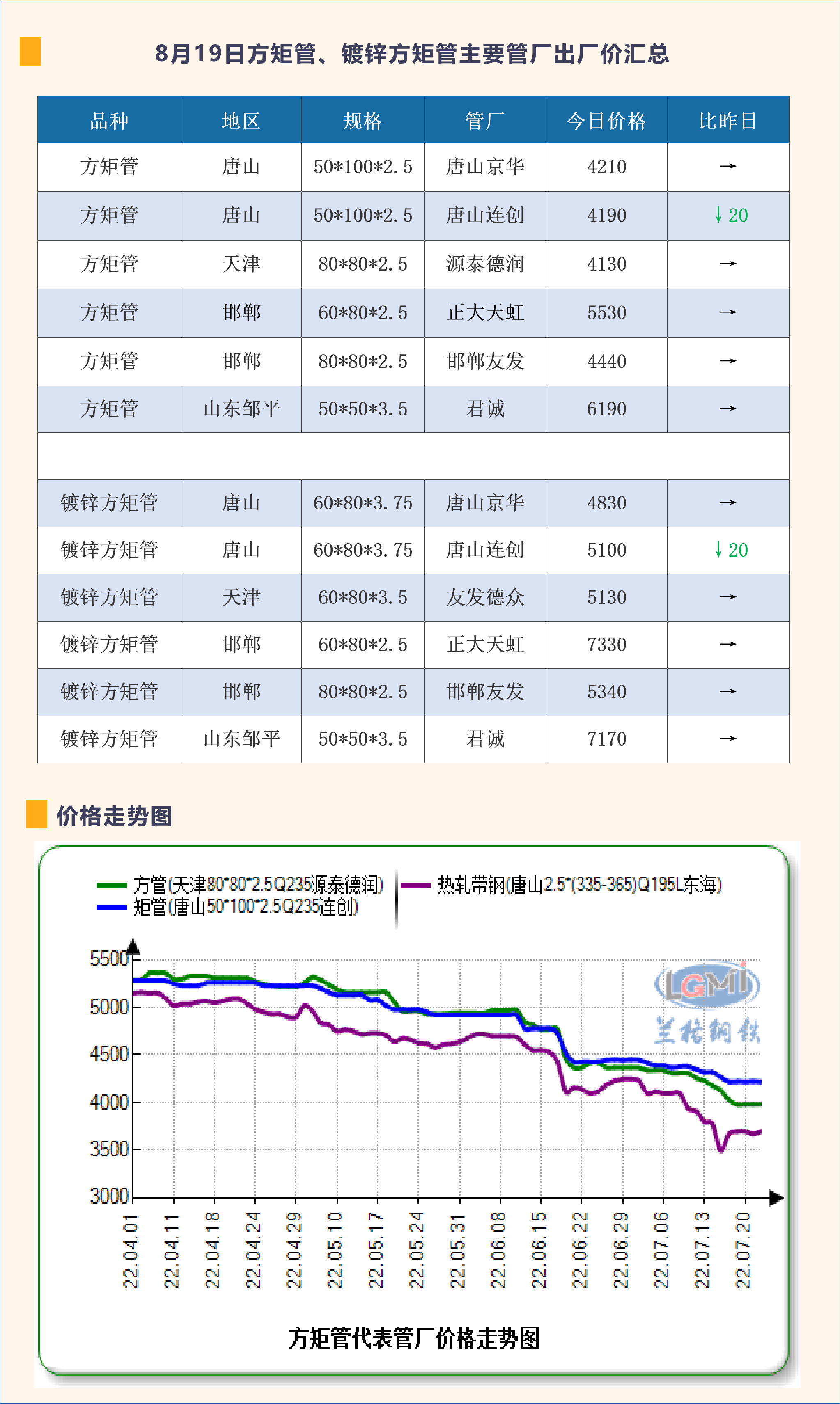 8月19日方矩管、镀锌方矩管主要管厂出厂价汇总