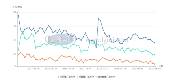 管厂方面,本周管厂出厂价格震荡走弱,以唐山为例,现唐山焊管4寸出厂价格4180元左右比上周五下调40元,镀锌管4寸出厂4890元左右比上周五价格下调30元。本周初,部分管厂政策力度较大,各品牌价差有所缩小。但总的来看,目前管厂对后期行情依然持谨慎乐观心态,管厂挺价意愿较强,利润整体有所修复。库存及成交方面,据统计,天津唐山邯郸主流管厂:截止8月19日,华北主流管厂本周总库存60.77万吨,比上周同期增0.88万吨,比上月同期降4.05万吨,比去年同期降23.86万吨;日均成交量3.03万吨,比上周同期减0.01万吨,比上月同期增0.05万吨,比去年同期减0.31万吨。总的来看,管厂数据变化不大,目前开工率仍维持80%。