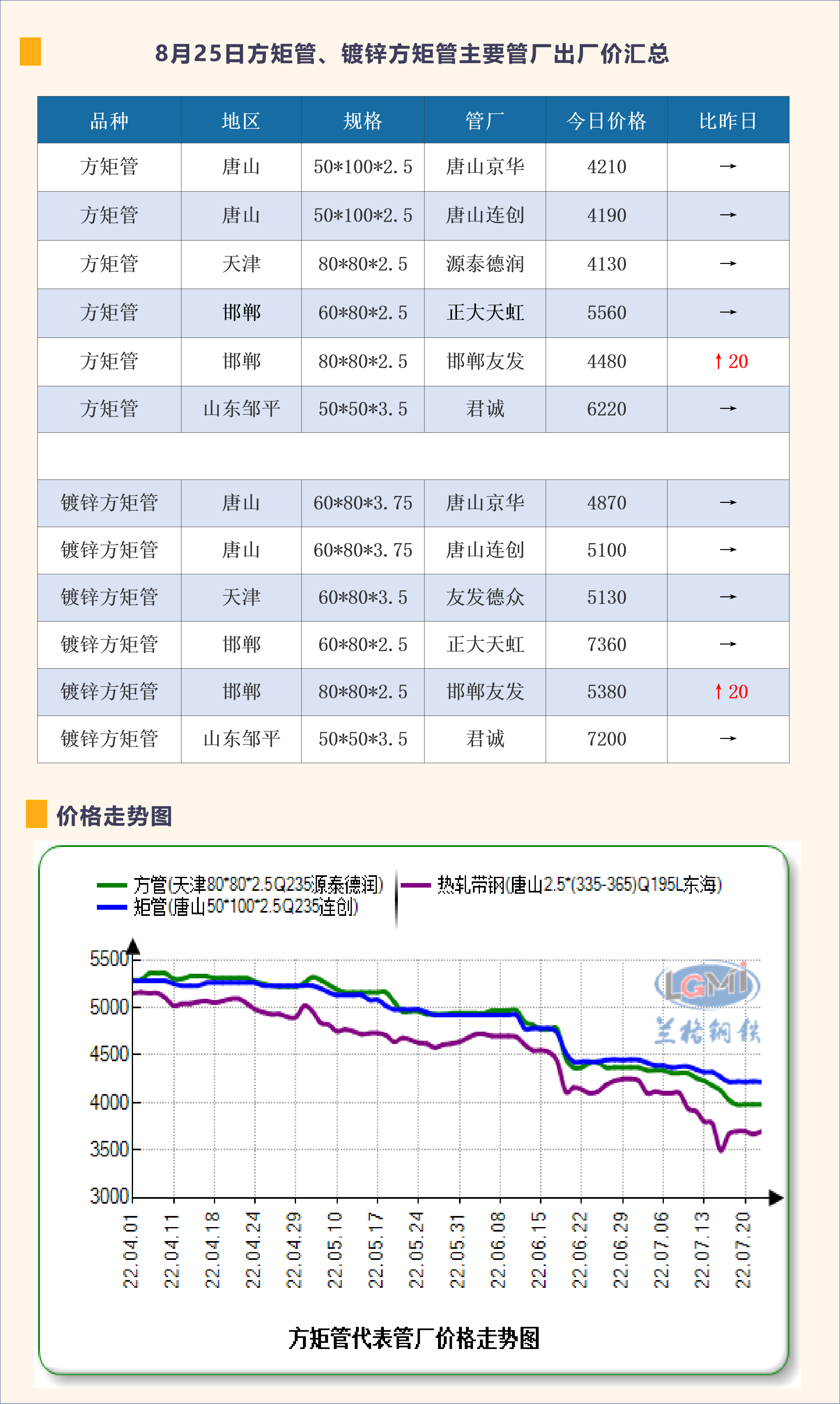 8月22日方矩管、镀锌方矩管主要管厂出厂价汇总
