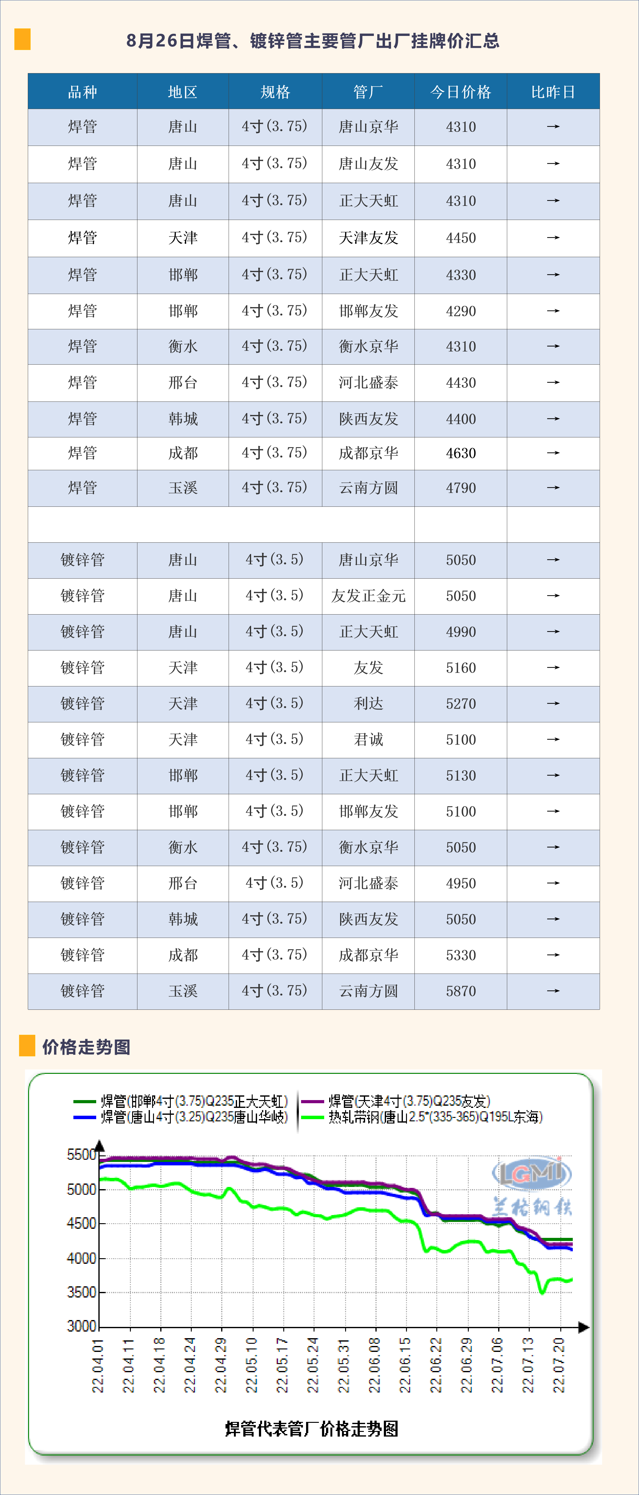 8月26日焊管、镀锌管主要管厂出厂挂牌价汇总