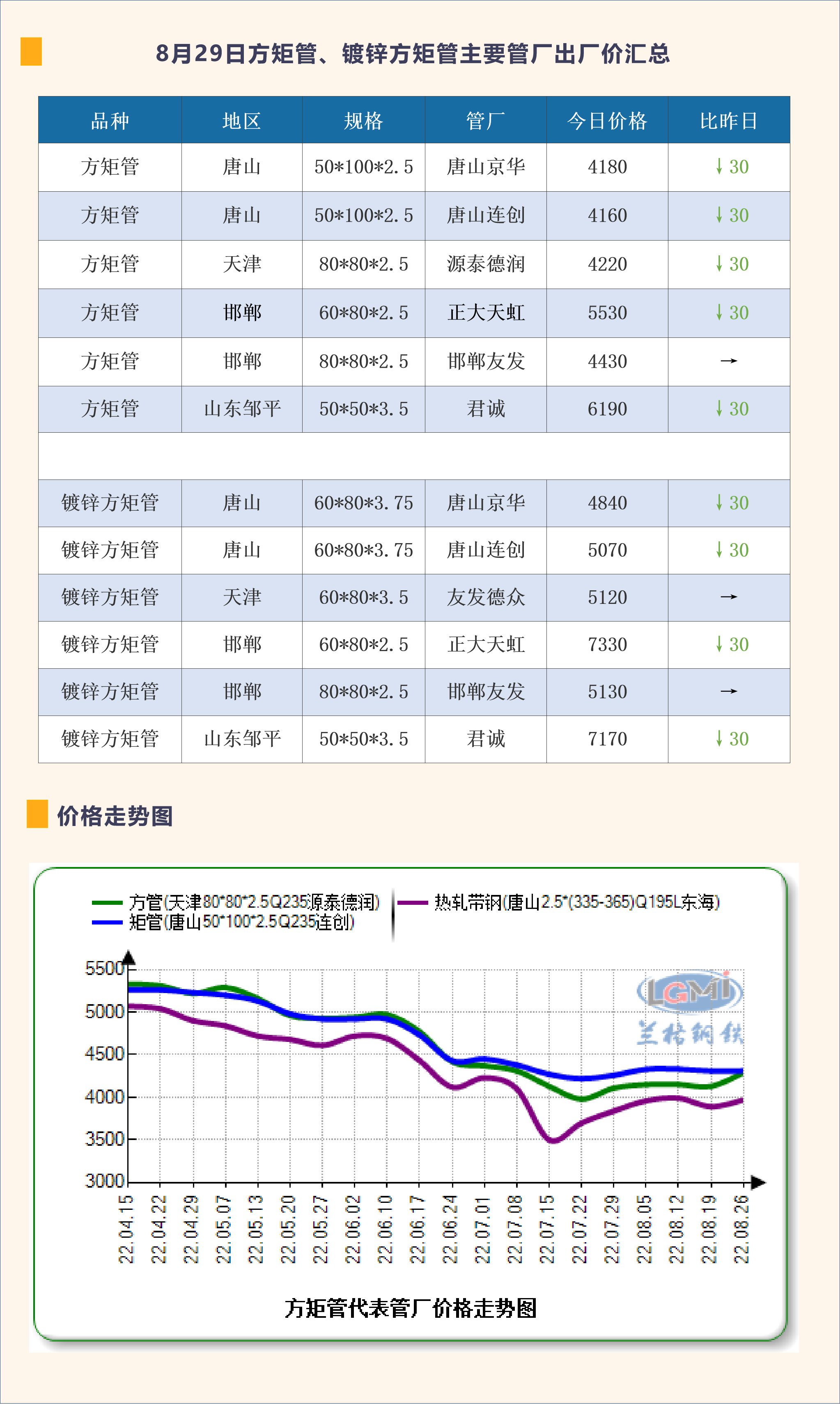 8月29日方矩管、镀锌方矩管主要管厂出厂价汇总