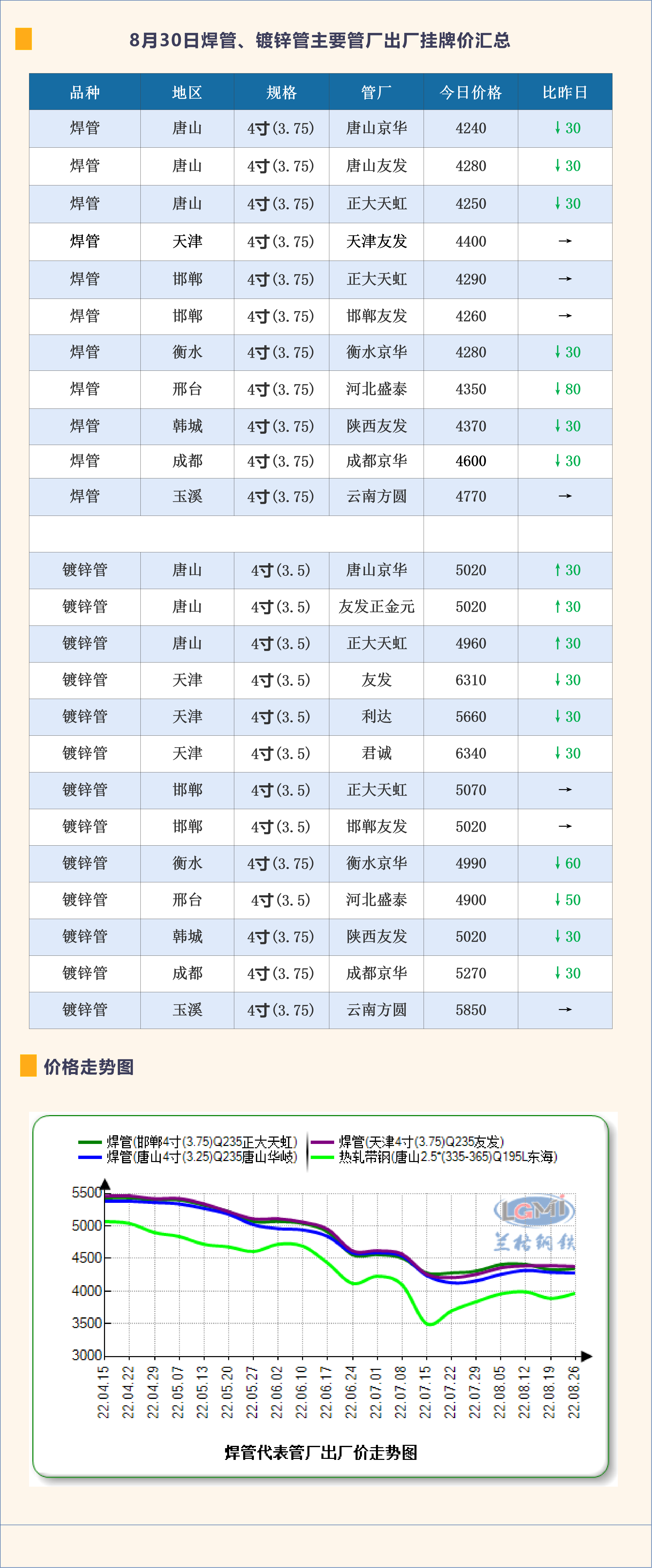 8月30日焊管、镀锌管主要管厂出厂挂牌价汇总