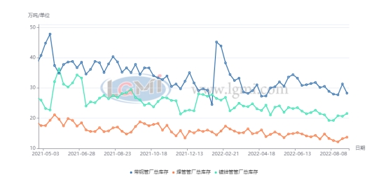 管厂方面,本周管厂出厂价格降后趋稳,以唐山为例,现唐山焊管4寸出厂价格4090元左右比上周五下调60元,镀锌管4寸出厂4800元左右比上周五价格下调60元。上周末,美联储主席鲍威尔“鹰派”发言传递9月份加息有可能由原来预期的25个基点增加至50-75个基点,此番发言波及黑色系及大宗商品价格大幅跳水,焊管价格下跌120元以上,本周期盘开盘持续低位震荡,市场观望情绪增浓。不过随着消息被市场逐步消化,周中价格出现止跌企稳迹象,管厂继续下调价格意愿偏弱,目前管厂开工率维持上周,原料减少而成品增加,据统计,天津唐山邯郸主流管厂:截止9月2日,华北主流管厂本周总库存63.6万吨,比上周同期降1.67万吨,其中:原料带钢库存28.29万吨,比上周同期降3.04万吨,比上月同期降0.6万吨,比去年同期降6.93万吨;焊管库存13.74万吨,比上周同期增0.47万吨,比上月同期增0.41万吨,比去年同期降1.95万吨;镀锌管库存21.57万吨,比上周同期增0.9万吨,比上月同期增2.28万吨,比去年同期降6.58万吨;日均成交量3.28万吨,比上周同期增0.11万吨,比上月同期减0.16万吨,比去年同期增0.25万吨。