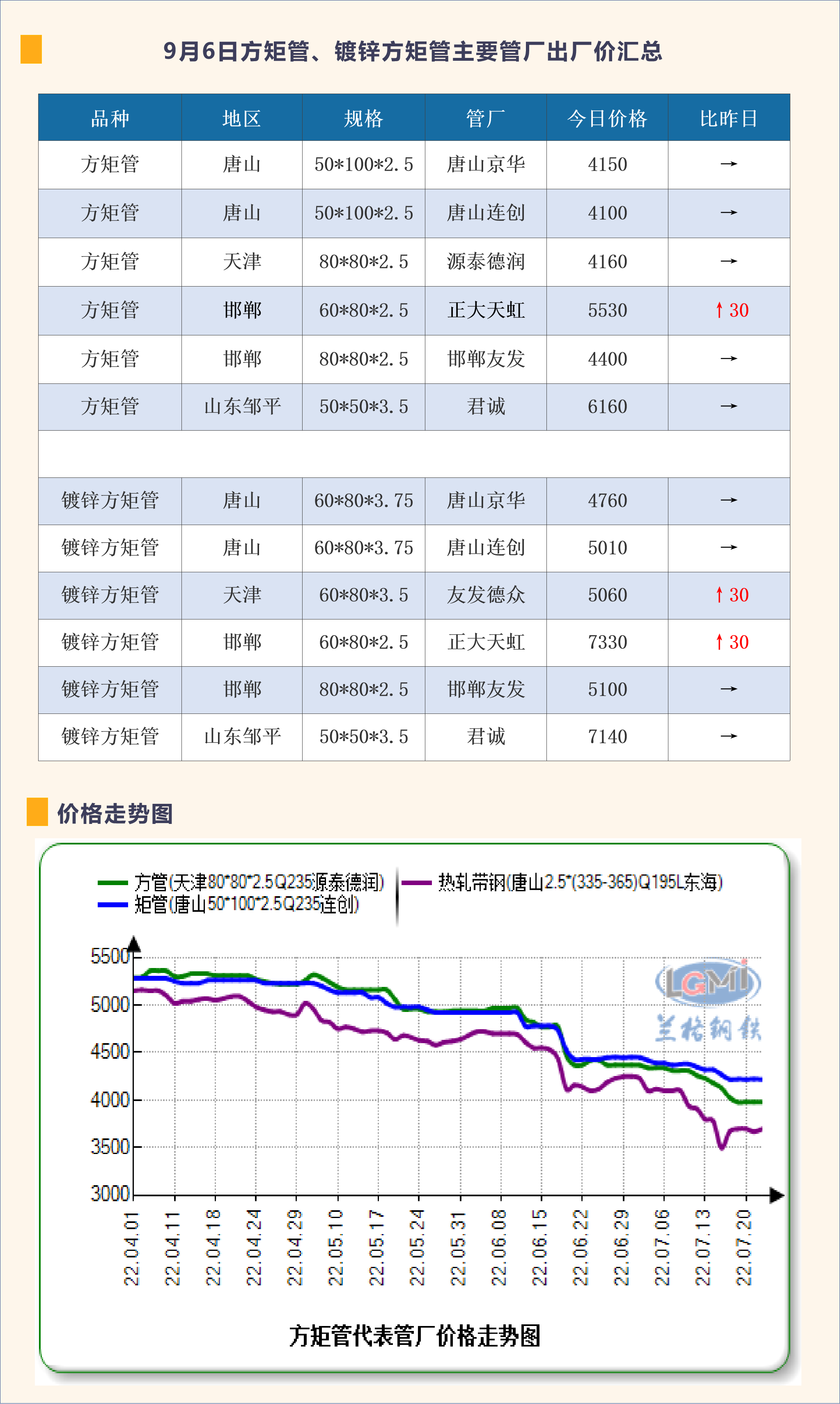 9月6日方矩管、镀锌方矩管主要管厂出厂价汇总