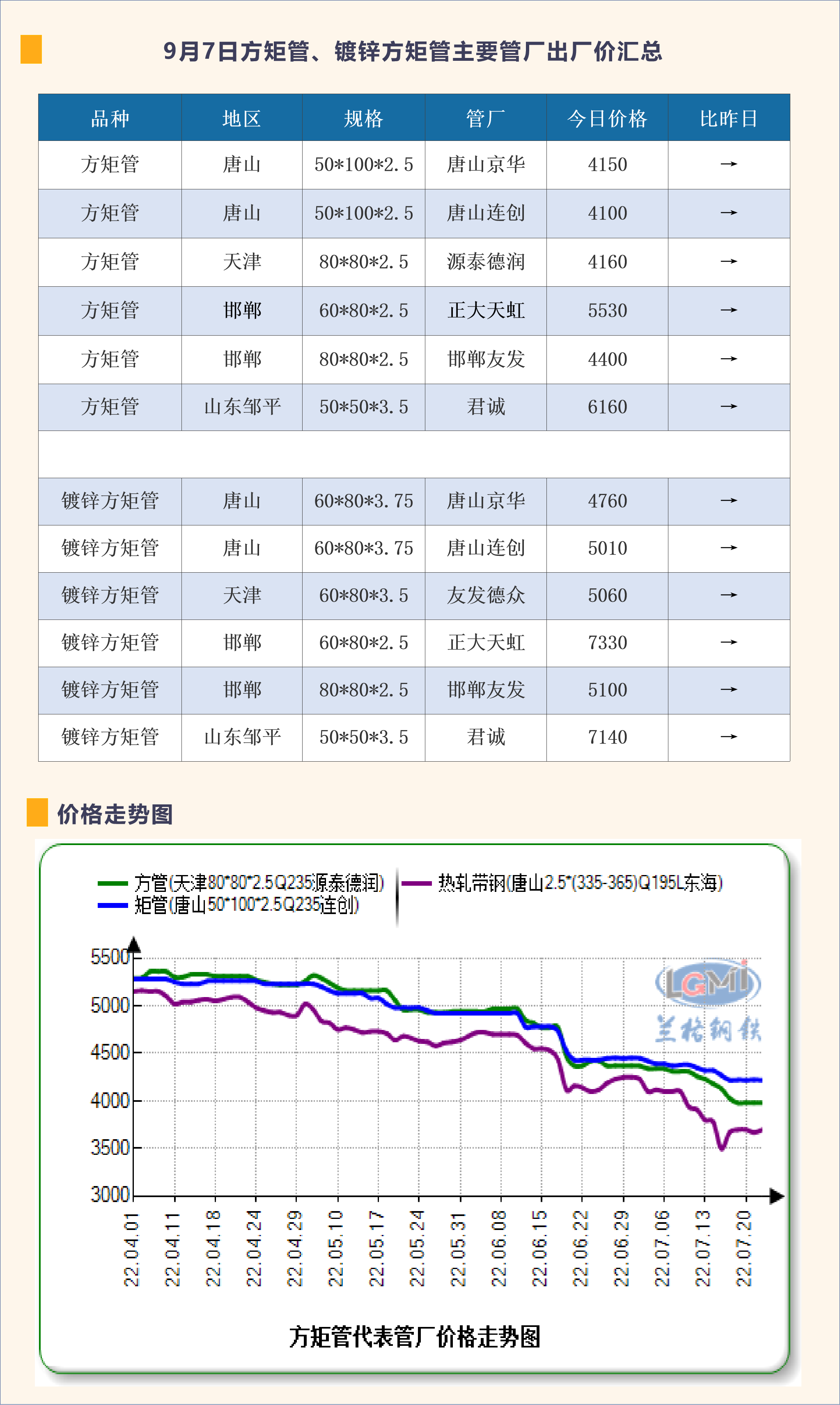 9月7日方矩管、镀锌方矩管主要管厂出厂价汇总