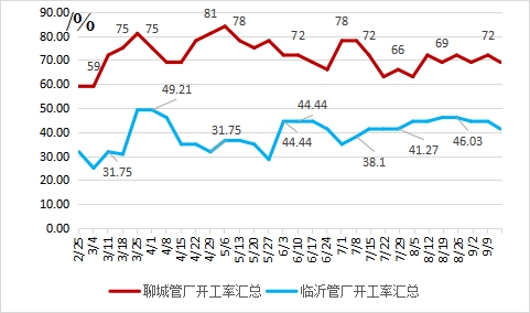 图1 山东地区管厂无缝管库存趋势图 截至9月15日(本周四),据兰格调研,山东临沂、聊城、潍烟21家样本无缝管厂总库存45.24万吨,周增加2.33万吨,周环比增加5,。4%,其中临沂、潍坊、烟台均增加1.31万吨、1.87万吨。 解析:本周,潍坊地区无缝管库存增幅较大,磐金厂内库存较高,临沂地区出货情况不佳,形成累库,国内外经济状况不容乐观,下游均按需采购,整体出货情况较差。 二、山东地区管厂:山东地区开工率小幅下降