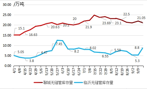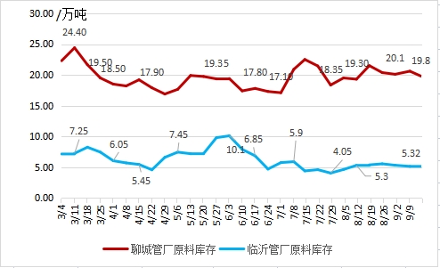 图3 山东地区管厂原料库存周变化趋势图 截至9月9日,山东地区临沂、聊城两地管厂管坯总库存24.85万吨,较上周减少0.89万吨,其中临沂地区总库存5.05万吨,较上周减少0.09万吨,聊城地区总库存19.8万吨,较上周增加0.8万吨。 解析:本周,临沂、聊城地区管坯库存量下降,临沂钢投特钢今日下午开始投产45#产品。江浙沪管坯陆续流入山东地区,据了解,当前江浙管坯价格较山东地区偏低,江浙一带受台风影响本地市场出货较差,加之运费较低,因此多数江浙管坯资源流入山东。 |