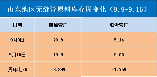 图2 山东地区管厂无缝管产线开工周变化趋势图 截至9月15日,据兰格调研,山东临沂、聊城、潍/烟地区21家样本108条产线(连轧10条连轧)开工率51.8%。泰宗管厂检修产线,预计10-13天,具体时间待定。临沂地区开工率因此下降,聊城、烟台基本维持不变,小幅波动为主。 解析:本周,部分管厂陆续计划检修,因此开工率小幅下降,加之前期接单量较为饱满,本月集中出货为主,因此管厂开工率维持不变。 三、山东地区管厂:山东地区原料库存下降为主 表2 山东地区管厂原料库存周变化