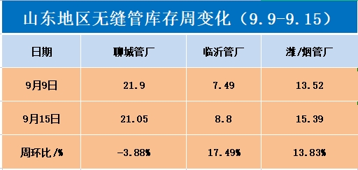 导语:本周全国主流无缝管厂出厂价格稳中偏弱,本周全国库存小幅增加至75.41万吨。全国无缝管厂开工率61.2%,周环比下降1.1%。中秋节后无缝管厂出货情况一般,部分管厂检修。近期期货震荡幅度较大,9月美联储极大概率加息75个基点。受此影响,美股、原油、一些商品连带国内黑色系商品纷纷下跌,但影响有限。一、山东地区管厂:临沂、潍烟地区管厂库存增加表1 山东地区管厂无缝管库存周变化