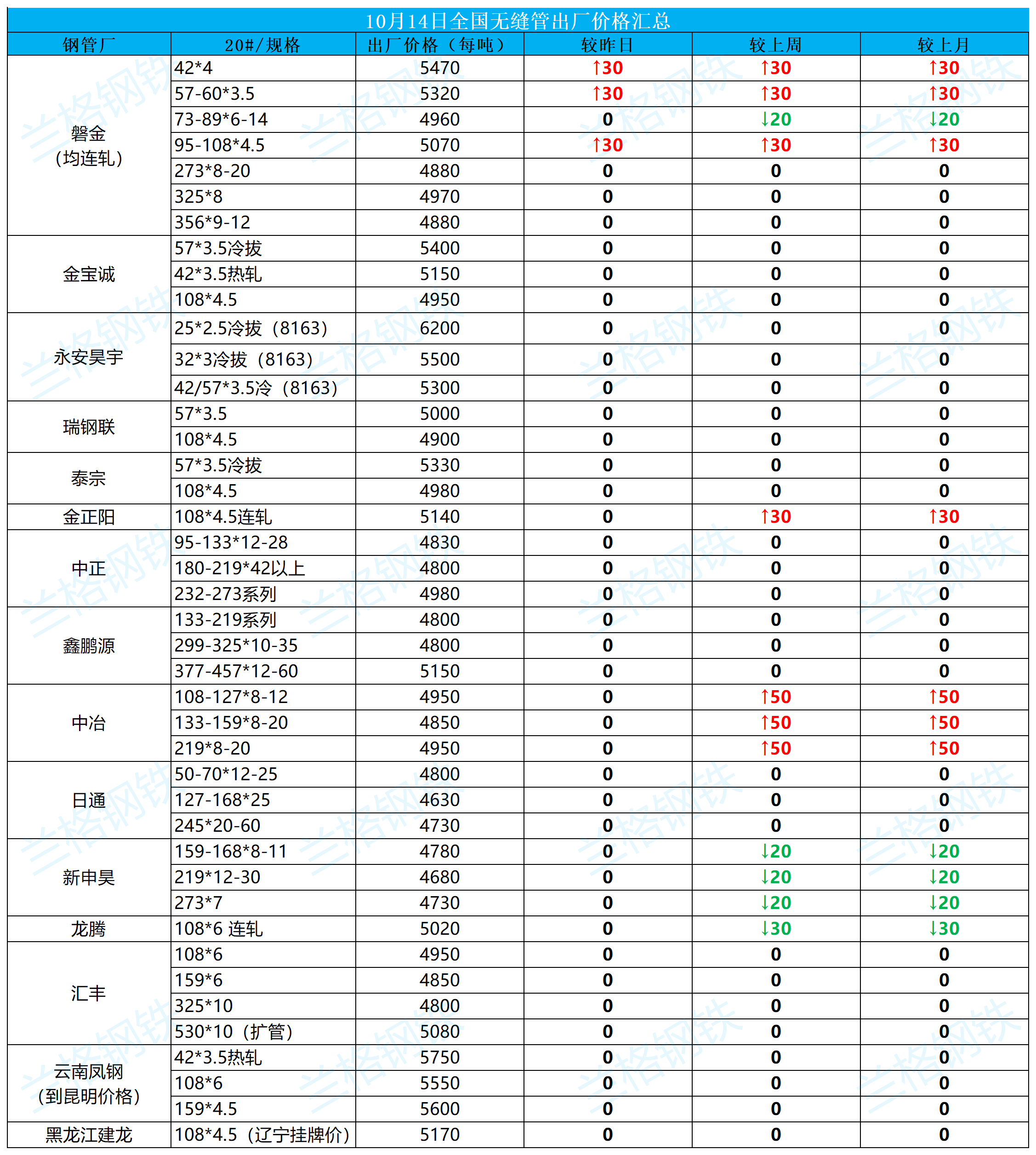10月14日全国无缝管出厂价格汇总