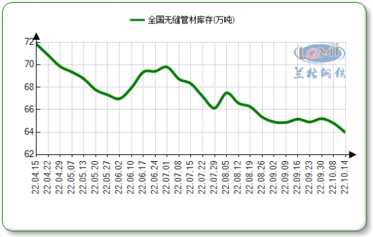 据兰格钢铁云商数据平台监测显示:截至14日国内二十三个城市无缝管社会库存总量63.96万吨,周环比下降1.3%,月同比下降1.85%,年同比下降5.54%。