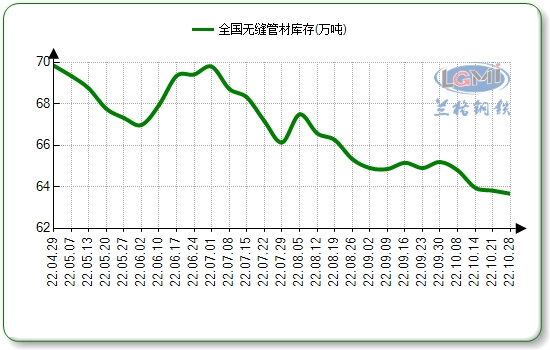 据兰格钢铁云商数据平台监测显示:截至28日国内二十三个城市无缝管社会库存总量63.67万吨,周环比下降1.3%,月同比下降0.24%,年同比下降3.8%。