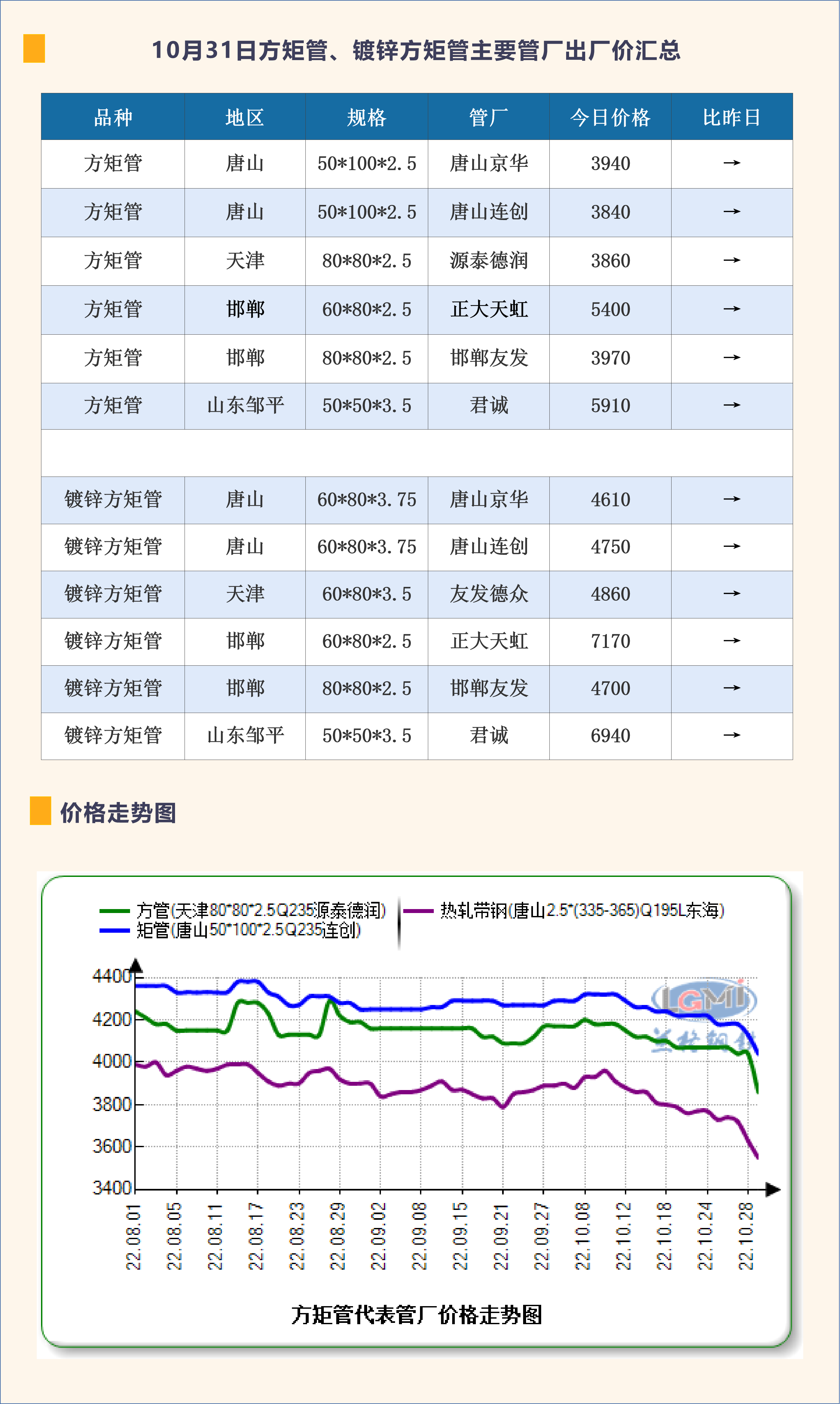 10月31日方矩管、镀锌方矩管主要管厂出厂价汇总