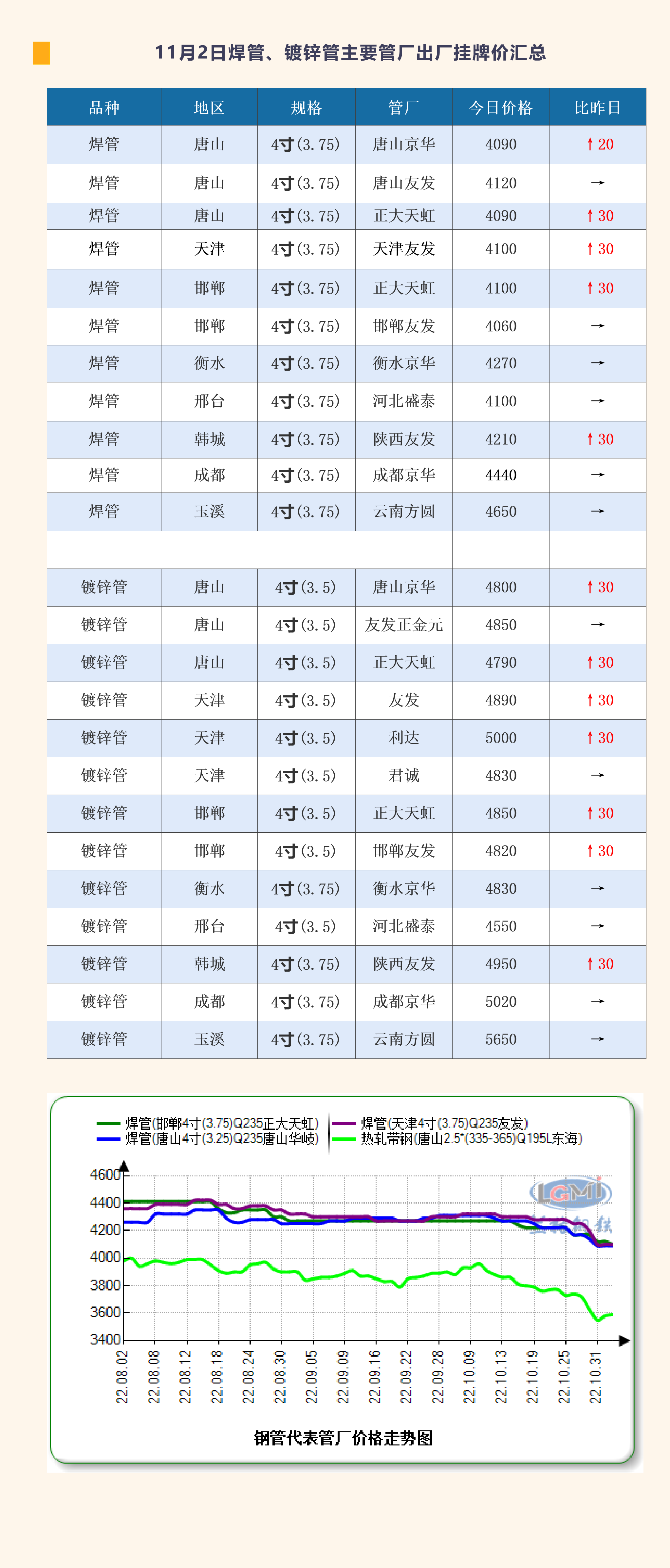 11月1日焊管、镀锌管主要管厂出厂挂牌价汇总