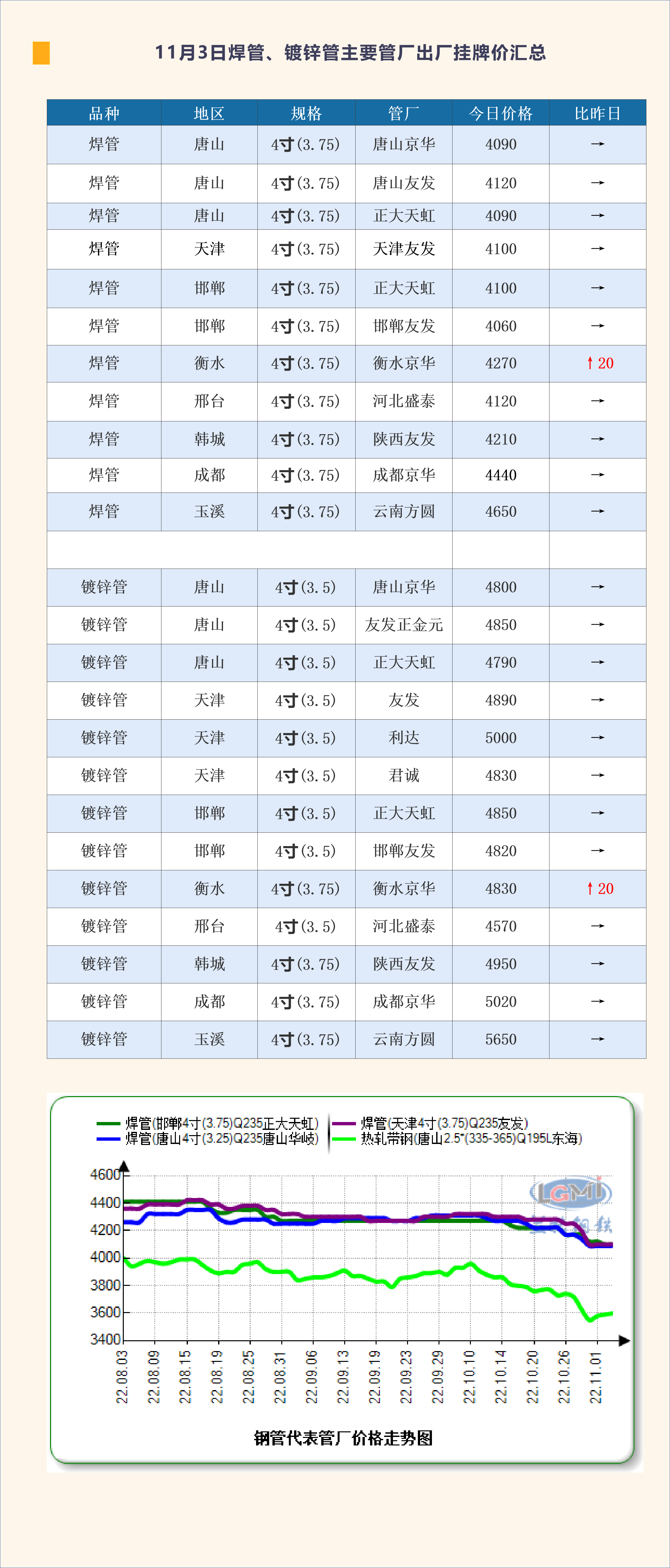 11月1日焊管、镀锌管主要管厂出厂挂牌价汇总