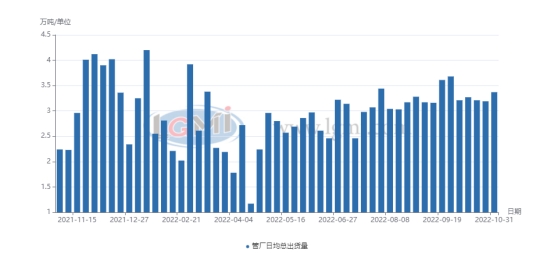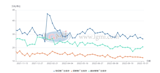 管厂方面,本周管厂出厂价格继续下行,以唐山为例,现唐山焊管4寸出厂价格3920元左右比上周同期降90元,镀锌管4寸出厂4630元左右比上周同期降70-80元。周初,期货尾盘跌破3400点位,市场情绪整体悲观,管厂成交持续低迷,随着美联储加息落地,期货站3500点以上,市场悲观情绪稍缓,价格止跌反弹,但对成交提振有限。最新统计:截止11月3日,华北主流管厂本周总库存60.03万吨,比上周同期降0.02万吨,比上月同期增1.26万吨,比去年同期降15.68万吨。其中:带钢库存26.62万吨,比上周同期降1.09万吨,比上月同期降1.79万吨,比去年同期降6.17万吨;焊管库存12.65万吨,比上周同期降0.32万吨,比上月同期降0.46万吨,比去年同期降3.43万吨;镀锌管库存20.76万吨,比上周同期增1.39万吨,比上月同期增3.51万吨,比去年同期降6.08万吨;日均成交量3.37万吨,比上周同期增0.18万吨,比上月同期增0.16万吨,比去年同期增1.13万吨。
