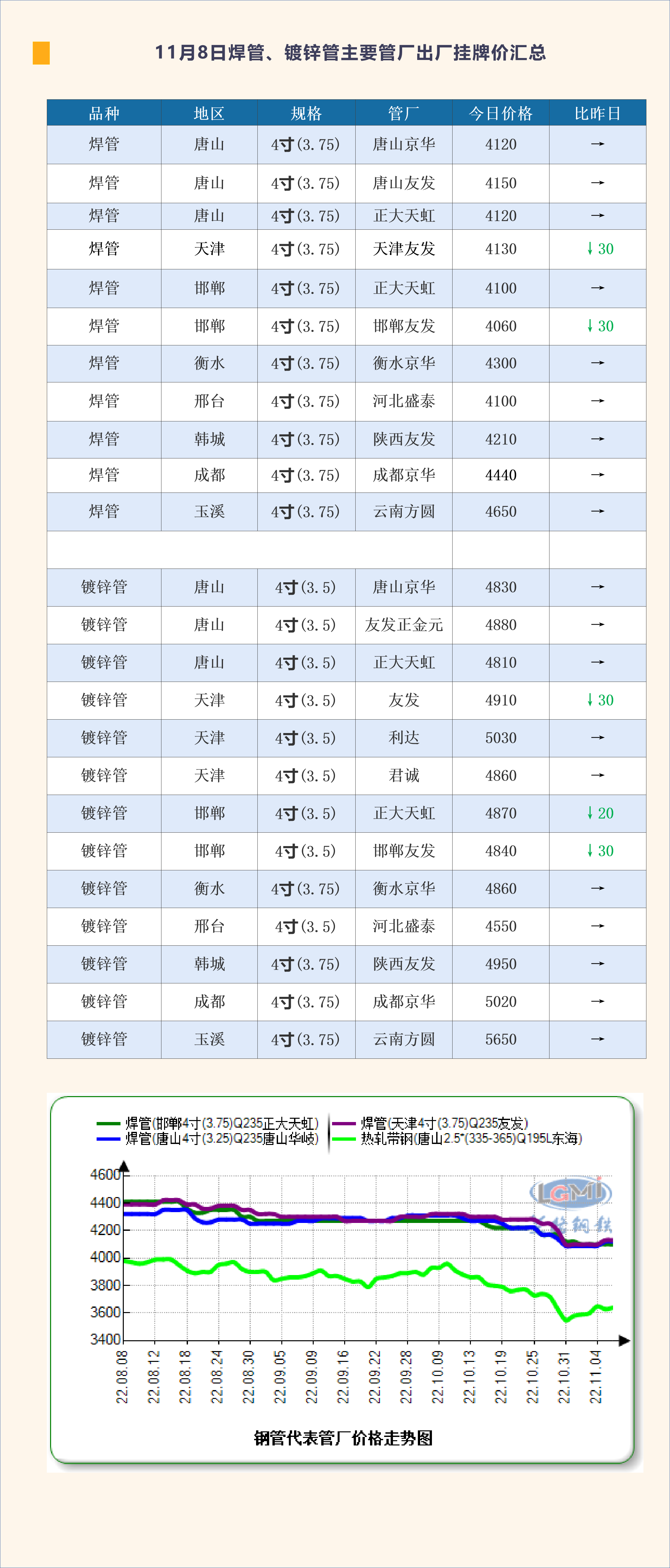 11月8日焊管、镀锌管主要管厂出厂挂牌价汇总